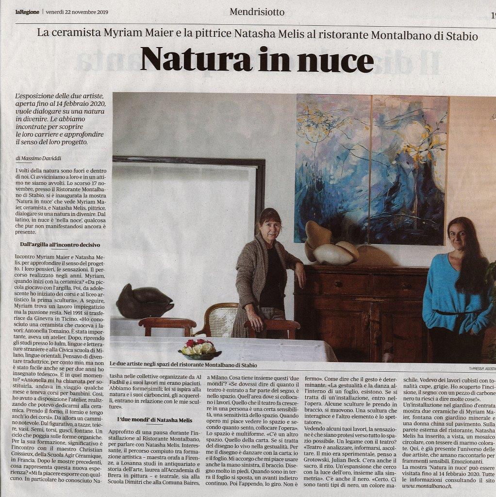 Natura in Nuce opere di Myriam Maier e Natasha Melis dal 17 novembre 2019 al 14 febbraio 2020 al RISTORANTE MONTALBANO Fam. Claudio Croci Torti Via Montalbano 34c 6854 San Pietro di Stabio Telefono +41 (0)91 647 12 06 Fax +41 (0)91 647 40 25 Giorni di riposo: Sabato a pranzo - domenica sera - lunedi | |